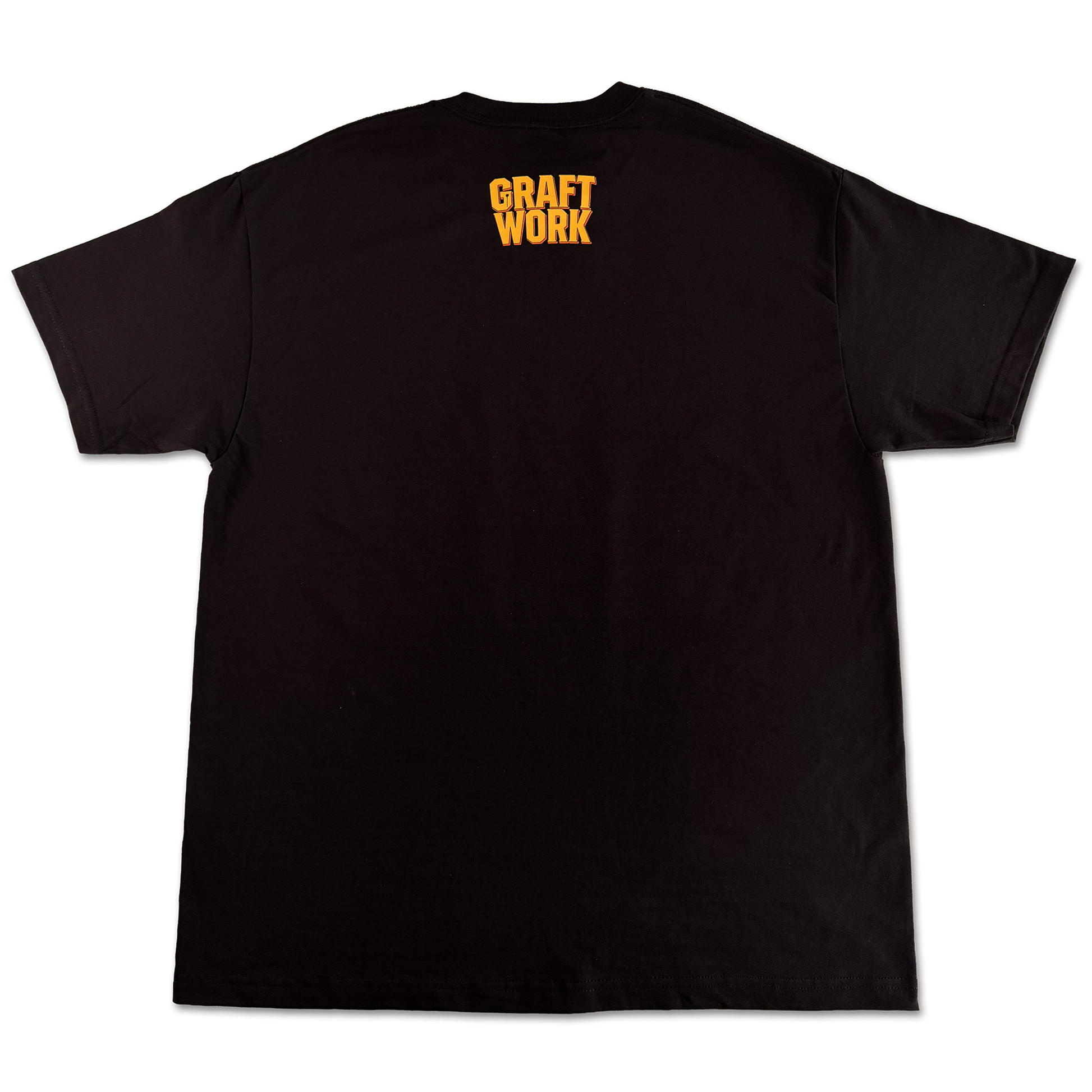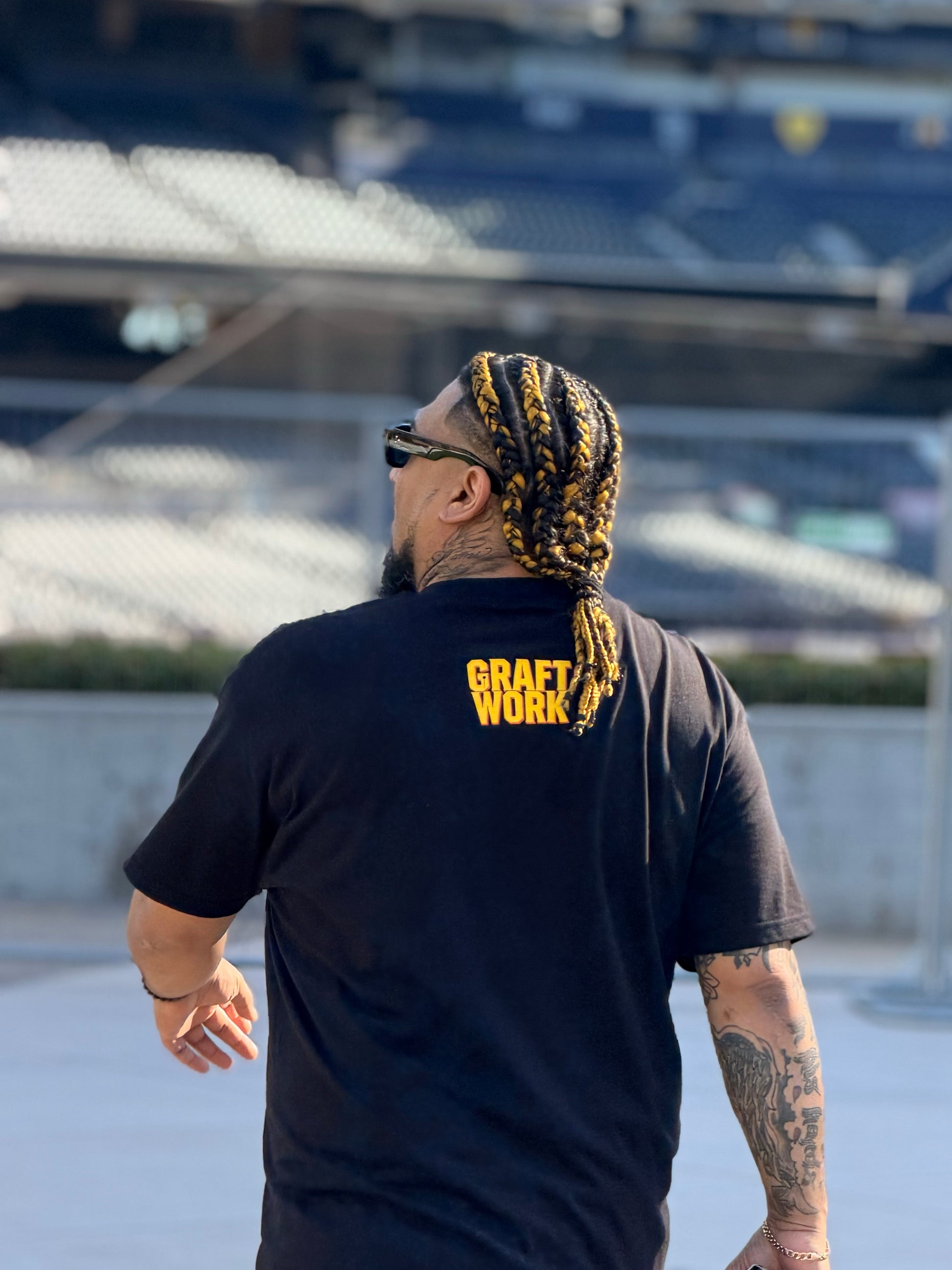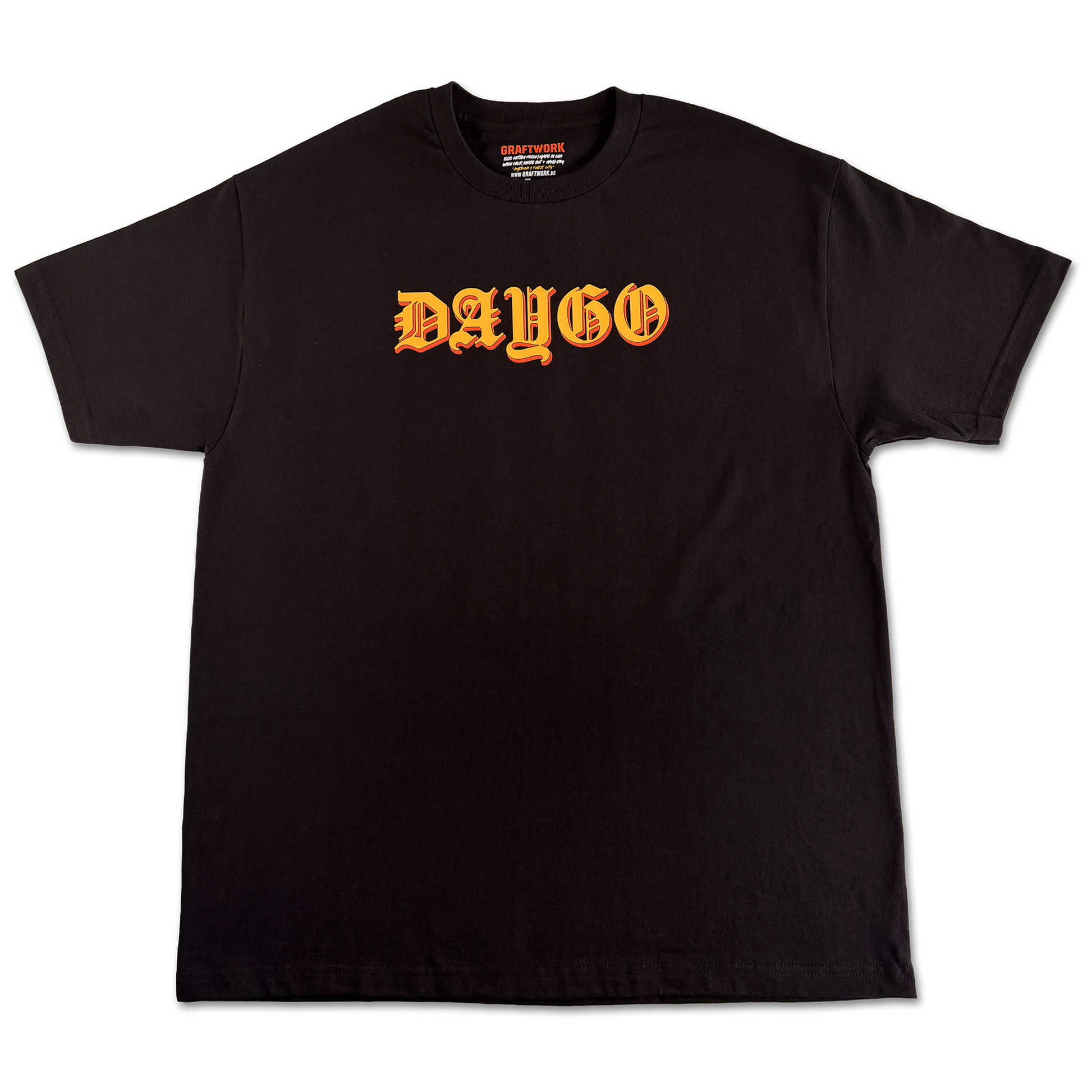 The Daygo Old English, Opeing Day ‘26 design is printed on a black tee with a deep gold and orange Old English script across the chest, inspired by the classic colors of the San Diego Padres, 1980s era jerseys. Finished with the gold and orange Graftwork Stacked logo on the upper back and matching neck/size print, it blends vintage San Diego baseball energy with timeless West Coast style.