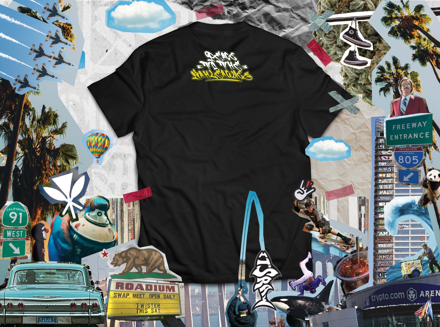 The "Hella Throwies" tee has a 12 x 9 inch, multi-colored front piece, a white and yellow size/neck tag and a 6 inch "Peace to the Kahleagues!" print on the back, centered below the neck.