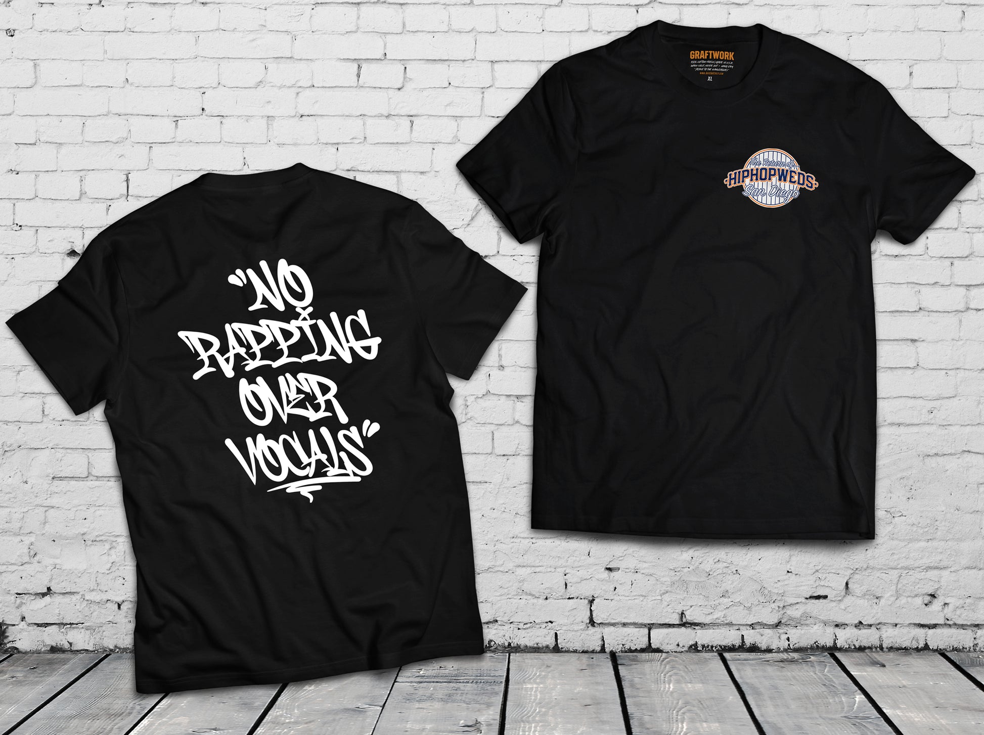 With a 4 x 2.5 inch HipHopWEDS logo, pocket print, an orange and white size/neck tag and a 12 x 9 inch back tag for the real Hip-Hop heads demanding... NO RAPPING OVER VOCALS!